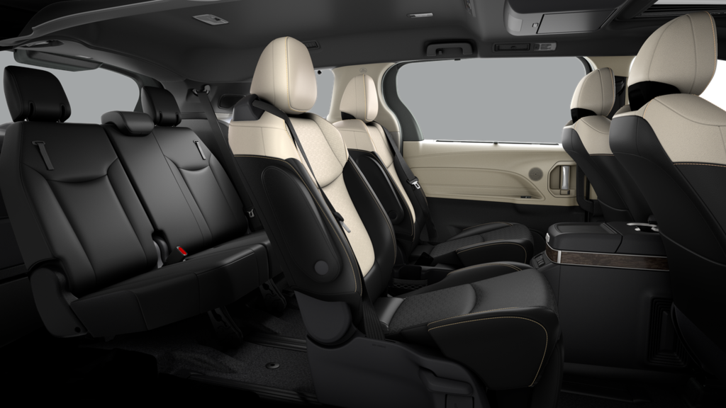 - 7-passenger seating with heated premium leather-trimmed second-row-seat captain's chairs with super-long-slide feature and ottomanssienna_ottomansienna_ottoman].Do not recline the seat when vehicle is in motion. Reclining the seat might negatively affect the fit of the seatbelt and increase the risk of death or serious injury. See. Owner’s manual. For limitations.,When spare tire is added to limited awd, platinum awd or 25th anniversary edition awd, second-row ottomans are removed.