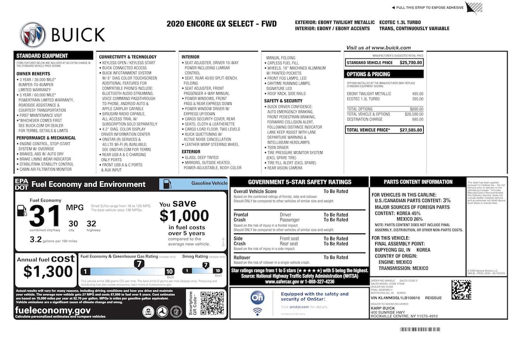 Heated Driver Seat, Back-Up Camera, Satellite Radio, Onboard Communications System, Aluminum Wheels. Non-Smoker vehicle Buick Select with Ebony Twilight Metallic exterior and Ebony with Ebony interior accents interior features a 3 Cylinder Engine with 155 HP at 5600 RPM*.