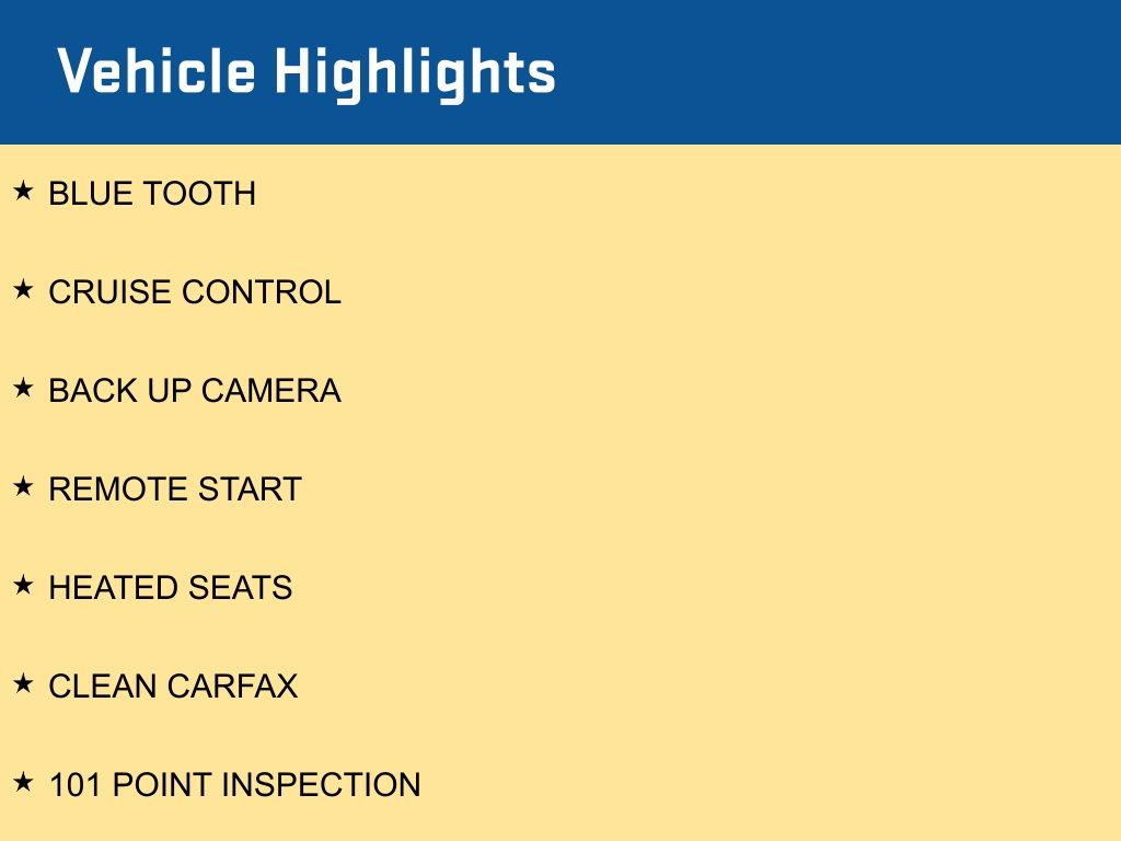BLUE TOOTH, CRUISE CONTROL, BACK UP CAMERA, REMOTE START, HEATED SEATS, CLEAN CARFAX, 101 POINT INSPECTION.