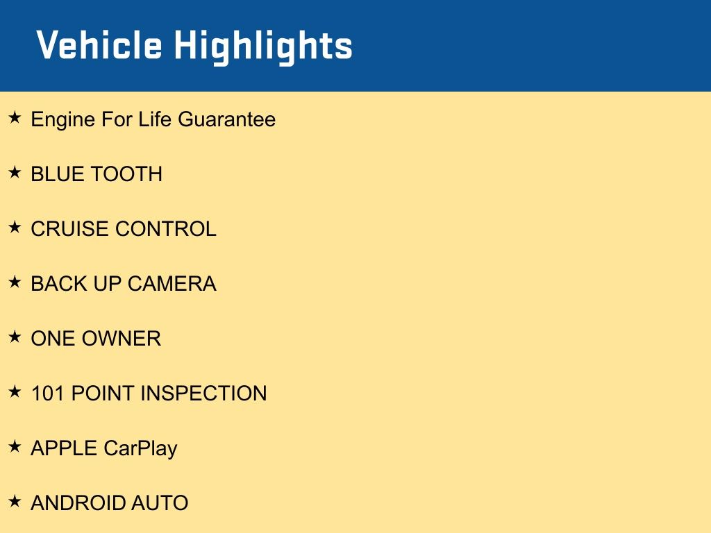 Engine For Life Guarantee, BLUE TOOTH, CRUISE CONTROL, BACK UP CAMERA, ONE OWNER, 101 POINT INSPECTION, APPLE CarPlay, ANDROID AUTO. CARFAX One-Owner. Odometer is 19371 miles below market average! 26/30 City/Highway MPG