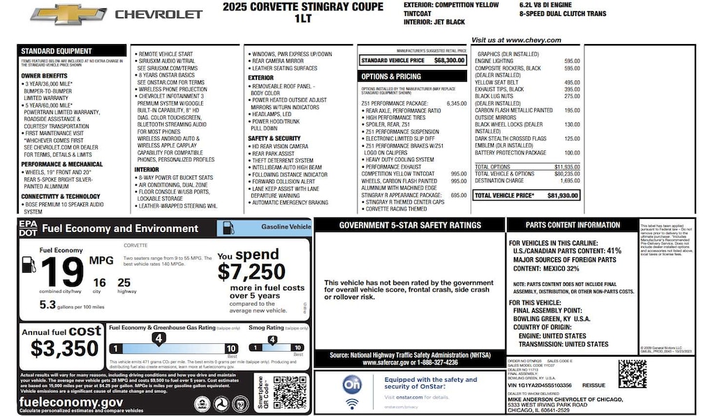 Z51 PERFORMANCE PACKAGE includes (J55) Z51 performance brakes, (FE3) Z51 performance suspension, (NPP) performance exhaust, (GM7) performance rear axle ratio, (G96) Electronic Limited Slip Differential (eLSD), (T0A) Z51 rear spoiler, front splitter, (XFQ) 245/35ZR19 front and 305/30ZR20 rear, blackwall, high performance tires and (V08) heavy-duty cooling system, WHEELS, 19 X 8.5 (48.3 CM X 21.6 CM) FRONT AND 20 X 11 (50.8 CM X 27.9 CM) REAR 5-OPEN-SPOKE CARBON FLASH-PAINTED ALUMINUM WITH MACHINED EDGE, AUDIO SYSTEM, CHEVROLET INFOTAINMENT 3 PREMIUM SYSTEM with Google built-in compatibility (select service plan required, terms and limitations apply) including navigation capability, 8 diagonal HD color touchscreen, includes multi-touch display, AM/FM stereo, Bluetooth® streaming audio for music and most phones; featuring Wireless Apple CarPlay® and Wireless Android Auto® capability for compatible phones, advanced voice recognition, in-vehicle apps, personalized profiles for infotainment and vehicle settings (STD), ENGINE, 6.2L V8 DI, HIGH-OUTPUT Variable Valve Timing (VVT), Active Fuel Management (AFM) (490 hp [365.4 kW] @ 6450 rpm, 465 lb-ft of torque [627.8 N-m] @ 5150 rpm) (STD), TRANSMISSION, 8-SPEED DUAL CLUTCH, INCLUDES MANUAL AND AUTO MODES (STD).
