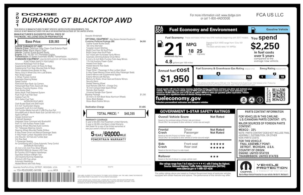 Engine: 3.6L V6 24V VVT UPG I w/ESS, Transmission: 8-Speed Automatic (850RE), Power 6x9 Multi-Function Foldaway Mirrors, Tungsten Accent Stitching, Remote Start System, 180 Amp Alternator, Heated Front Seats, Power 8-Way Driver Memory 6-Way Passenger Seats, Power Driver/Passenger 4-Way Lumbar Adjust, Exterior Mirrors w/Supplemental Signals, Auto Dim Exterior Driver Mirror, Dual Remote USB Port - Charge Only, 115V Auxiliary Power Outlet, Universal Garage Door Opener, Exterior Mirrors w/Memory, Heated Second Row Seats, Heated Steering Wheel, Power Liftgate, Security Alarm, Sun Visors w/Illuminated Vanity Mirrors, Radio/Driver Seat/Mirrors Memory, GT Gloss Black Badging, Satin Black Dodge Tail Lamp Badge, Wheels: 20 x 8.0 Black Noise Aluminum, Gloss Black Badges, Gloss Black Exterior Mirrors, (STD), (STD).