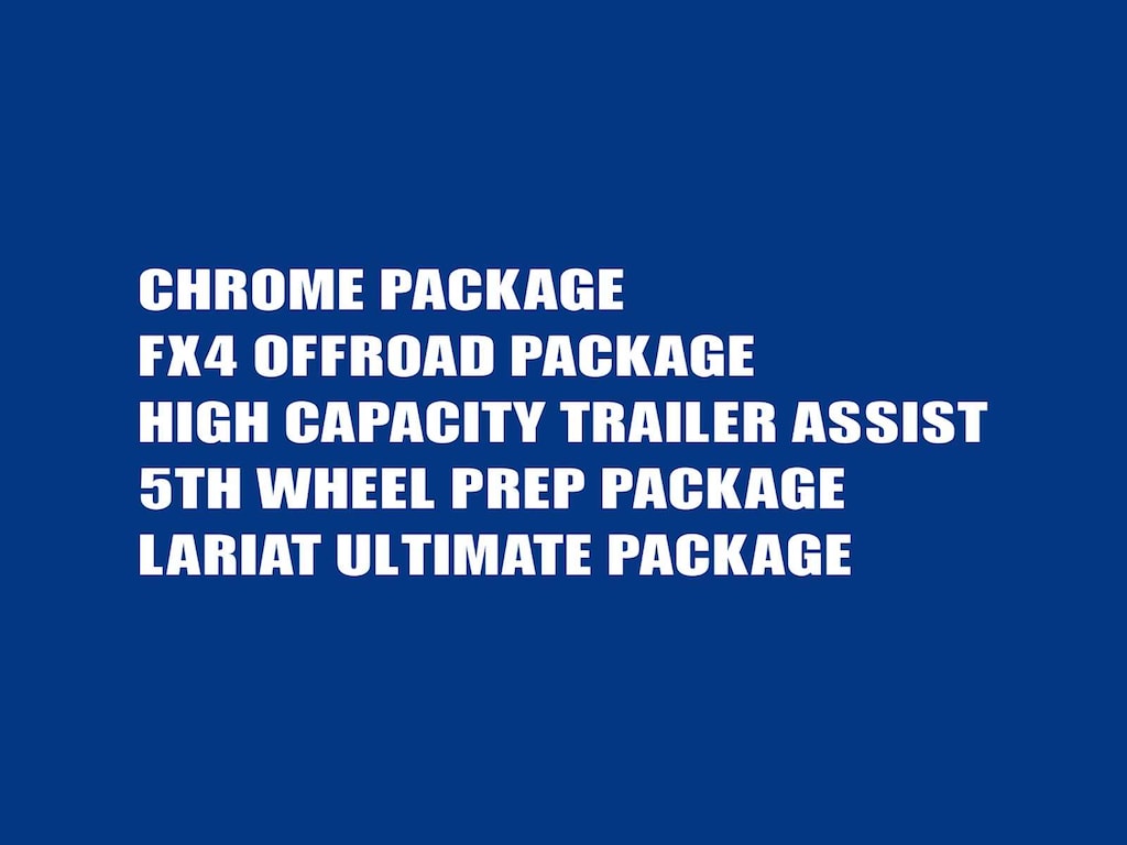 ENGINE: 6.7L 4V OHV POWER STROKE V8 TURBO DIESEL B20 manual push-button engine-exhaust braking and intelligent oil-life monitor, 240 Amp Alternator, 34 Gallon Fuel Tank, 3.31 Axle Ratio, Dual 78-AH 750 CCA Batteries, LARIAT ULTIMATE PACKAGE Power Heated/Ventilated Driver Seat w/Memory, PowerScope Trailer Tow Mirrors w/Memory, EASY ENTRY®/Exit Memory Drivers Seat Feature, Tailgate Step & Handle, LED Box Lighting, LED Center High-Mounted Stop Lamp (CHMSL), Intelligent Access w/Push-Button Start, Power Heated/Ventilated Passenger Seat, Memory Power-Adjustable Pedals, Remote Start System, Ambient Lighting - Fixed Color, Power Telescoping/Tilt Steering Wheel/Column, memory and audio controls, Remote Tailgate Release, PRO TRAILER BACKUP ASSIST - HIGH CAPACITY Note: Salespersons Portfolio or Trailer Towing Guide should be consulted for specific trailer towing or camper limits and corresponding required equipment, axle ratios and model availability, See Supplemental Reference for vehicle height consideration, Ultimate Trailer Tow Camera System, rear view camera, 360 degree camera system, rear CHMSL camera, trailer reverse guidance and LED center high-mounted stop lamp, High Capacity Trailer Tow Package, increased GCW from 23,500 lbs, to 30,000 lbs and upgraded axle, Note: Salespersons Portfolio or Trailer Towing Guide should be consulted for specific trailer towing or camper limits and corresponding required equipment, axle ratios and model availability, See Supplemental Reference for vehicle height, CHROME PACKAGE 2 front chrome tow hooks, Unique Chrome Mirror Caps, Wheels: 18 Chrome PVD Aluminum, Body-Color Door Handles w/Chrome Insert, 6 Angular Bright Polished Step Bars, Chrome Exhaust Tip, ELECTRONIC-LOCKING W/3.55 AXLE RATIO, TIRES: LT275/70RX18E BSW Automatic Transmission (4) Spare may not be the same as road tire, TRANSMISSION: TORQSHIFT 10-SPEED AUTOMATIC SelectShift and selectable drive modes: normal, tow/haul, eco, deep sand/snow and slippery.