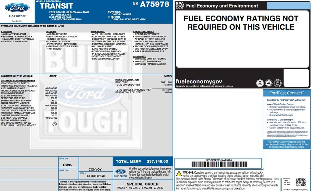 Flex Fuel, iPod/MP3 Input, Bluetooth®, WiFi Hotspot Ford Transit Cutaway with Oxford White exterior and Dark Palazzo Gray interior features a V6 Cylinder Engine with 275 HP at 6250 RPM*.