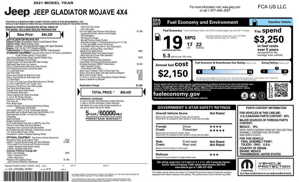 BODY COLOR 3-PIECE HARD TOP Freedom Panel Storage Bag, Rear Window Defroster, Rear Sliding Window, No Soft Top, TRANSMISSION: 8-SPEED AUTOMATIC (850RE) Tip Start, Transmission Skid Plate, Selec-Speed Control, 8.4 RADIO & PREMIUM AUDIO GROUP SiriusXM Traffic Plus, Alpine Premium Audio System, HD Radio, Radio: Uconnect 4C Nav w/8.4 Display, Rear View Auto Dim Mirror, For Details, Visit DriveUconnect.com, 1-Year SiriusXM Guardian Trial, GPS Navigation, SiriusXM Travel Link, Emergency/Assistance Call, 8.4 Touchscreen Display, BLACK, LEATHER TRIMMED BUCKET SEATS Full Length Floor Console Premium Armrest, Leather Wrapped Park Brake Handle, Leather Wrapped Shift Knob, Premium Door Trim Panel, Rear Armrest w/Cupholder Seat, LED LIGHTING GROUP Daytime Running Lamps LED Accents, LED Park Turn Lamps, Front LED Fog Lamps, LED Premium Reflector Headlamps, LED Taillamps, MOPAR HEAVY DUTY ROCK SLIDER W/STEP ASSIST, WHEELS: 17 X 7.5 LOW GLOSS BLACK POLISHED, SAFETY GROUP ParkSense Rear Park Assist System, Blind Spot & Cross Path Detection, TRAILER TOW PACKAGE Trailer Hitch Zoom, Class IV Hitch Receiver, Heavy Duty Engine Cooling, 240 Amp Alternator, MOPAR SPRAY IN BEDLINER, ENGINE: 3.6L V6 24V VVT UPG I W/ESS (STD).