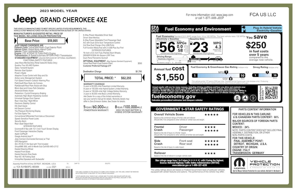 Navigation, Sunroof, Panoramic Roof, Power Liftgate, Heated Driver Seat Non-Smoker vehicle Jeep Grand Cherokee 4xe with Velvet Red Pearlcoat exterior and Global Black interior features a 4 Cylinder Engine with 375 HP at 5250 RPM*.